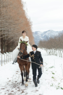 ブーケと雪、そして山茶花のコントラストがかわいい。ドレスのコート羽織も定着して冬ももはやオンシーズン。