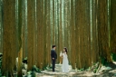 森の中、やさしく差し込む木漏れ日。緑に囲まれて、ふたりらしいナチュラルな時間を過ごす撮影。自然の中だからこそ残せる、リラックスした瞬間です。
