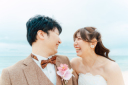 まずは開放感たっぷりのビーチから!真っ白な砂浜とお二人のウエディング姿が、青い海に美しく映えます。心地よい潮風を感じながら、穏やかな時間の始まりです♪