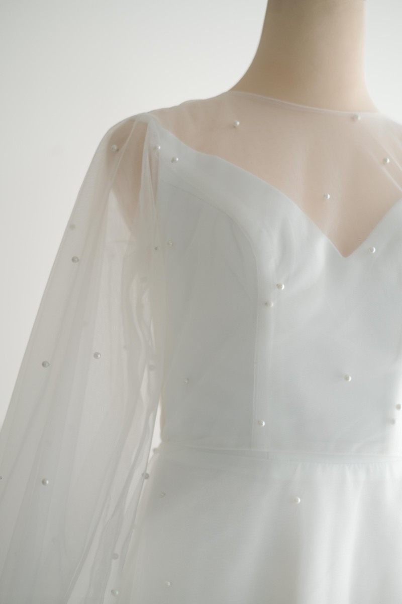 ドレス全体にパールが散りばめられているおしゃれなドレスです!長袖で露出を控えながらも、重くなりすぎないシフォン素材で軽やかな印象になります♩サイズはMサイズとなっております。