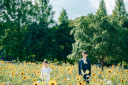 トレンドの黒のドレスはとことんカッコ良く!新郎様も黒スーツにして、深い緑とのコントラストが素敵です