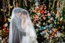 パッと映える鮮やかなオレンジのカラードレスで裾をハート型に♡ ご新郎様とお子様をご新婦様の愛で包みます♡