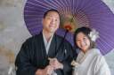 和装を着て浅草寺での撮影です!1つの和傘にお二人で♪