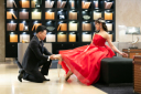 重厚な黒い木製の本棚を背景に、鮮やかな赤のドレスがひときわ映える新婦様。本に囲まれた静かな空間の中で見せた笑顔は、まるで映画のワンシーンのよう。