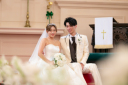 新婦様が横からそっと新郎様を覗き込む瞬間、チャーチの静けさの中に優しい笑顔が咲きました。永遠を誓う場所に、ふたりらしいぬくもりが広がります。