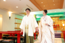 結婚式場ならではの神殿参道にて、和装姿のふたりが並ぶ一枚。厳かな空気と日本の美が調和し、特別な節目を静かに刻みます。