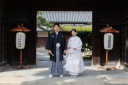 縁側で寄り添うおふたりを落ち着いた空間で撮影。和の趣とやさしい光に包まれた上品な一枚に仕上がっています