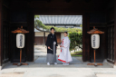 古民家の門前での一枚。和の趣ある空間におふたりの凛とした佇まいが映える、王道ながらも印象的なカットです。