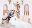 当店の洋装撮影で1番多く選ばれる背景であるお花の背景では、白無垢や淡いお色味の色打掛でもおしゃれな雰囲気の1枚をお撮りいただけます!