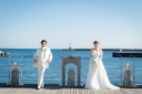 熱海の海は波も穏やかです。トレーンの長いドレスが浜辺に映えます!