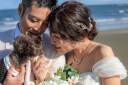ブルーのカラードレスにお色直しし、格好良い1枚。上品でエレガントな印象に。