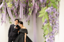 藤の花が垂れる空間で、番傘を手に寄り添う二人。やさしい紫に包まれた、和装ならではの穏やかな笑顔が印象的な一枚。