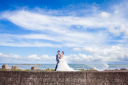 広い空と海を背景に撮影スタート。風に乗って伸びるロングベールが印象的で、自然の中に立つだけで凛とした一枚に。